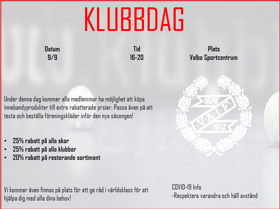 Hej Nu på Fredag 22/10 tom Söndag 24/10 har vi 25% på hela sortimentet på Klubbhuset, så passa på att handla till Julen och säsongen. Ange Kod: OKT25 Innebandysektionen 21 okt 2021 0kommentarer